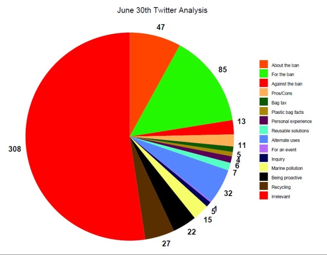 In this graph of June 30th, you can see that even though there were 308 irrelevant tweets (about a half), almost a quarter of the tweets were solely facts about the ban. On this particular ban, fact about bans around the world were the most popular tweets. Stories were featured from Canberra Australia, Italy, Ireland, Los Angeles County, the Outer Banks, New York City, Mumbai India, and other cities throughout the US. A tweet from @EarthActivists caused a massive retweeting of a prompt to recycle plastic bags as well as cease using them all together. Another strong retweeted tweet was that from Puma, explaining how Puma made 100% biodegradable bags that can be composted in water or in compost, made with eco-friendly dye.